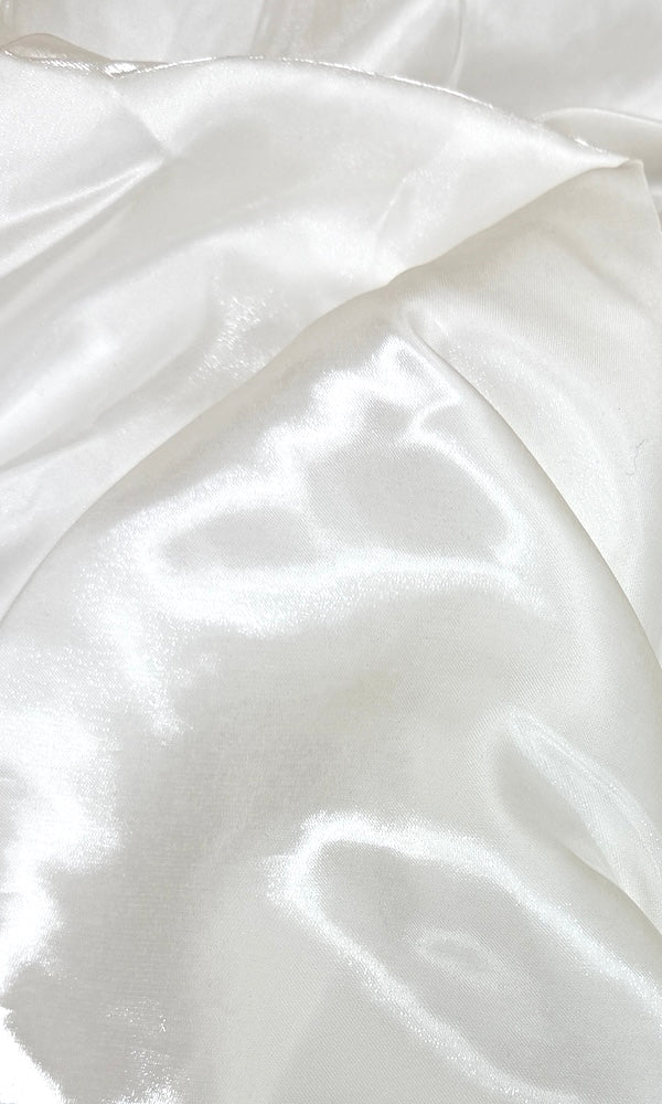 White. A clean, luminous white with a high-gloss satin finish, designed for modern bridal ceremonies and fashion-forward wedding celebrations. This shade reflects light beautifully and offers a refined, editorial alternative to traditional bridal gowns. Fabric color may appear brighter due to flash photography.